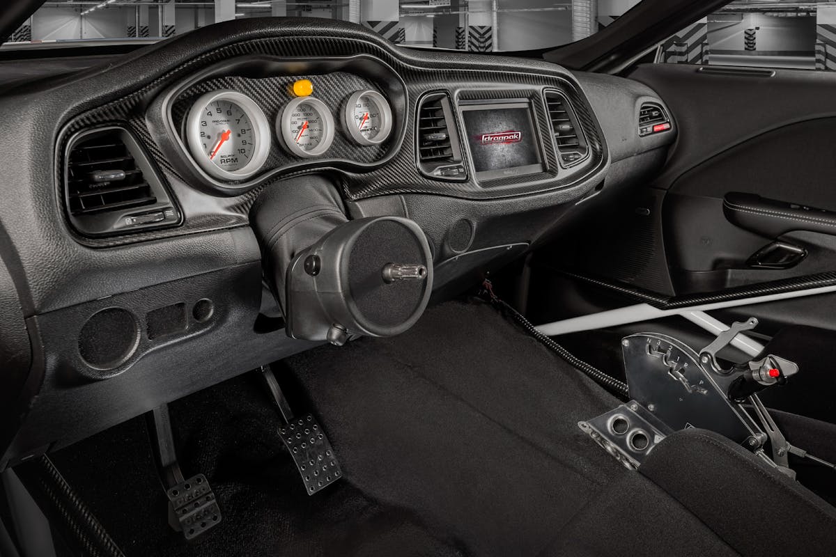 An all-new motorsport electrical architecture setup includes the “brains” of the supercharged HEMI powertrain in the programmable Holley Dominator Electronic Fuel Injection (EFI) vehicle-management system. In addition, a programmable Racepak Smartwire Power Distribution Module controls all electrical components using solid-state electronics, which eliminates the need for fuses and relays. These electronic modules are conveniently mounted to the body using bespoke mounts that allow for easy service with factory fit-and-finish.