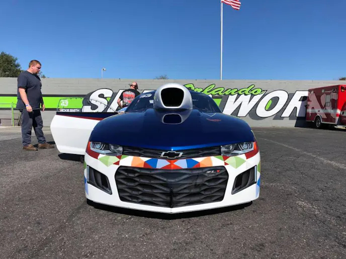 Doorslammer drag racing veteran and three-time NHRA Pro Modified world champion Rickie Smith added yet another accolade to what is one of the most storied racing resumes in drag racing history on Wednesday when he recorded the first quarter-mile pass under 5.70-seconds by a nitrous oxide-assisted doorslammer at the Orlando Speed World Dragway. The King, North Carolina racer is testing this week in Orlando with longtime crewman Chad Hester in preparation for the upcoming NHRA season opener in Gainesville.