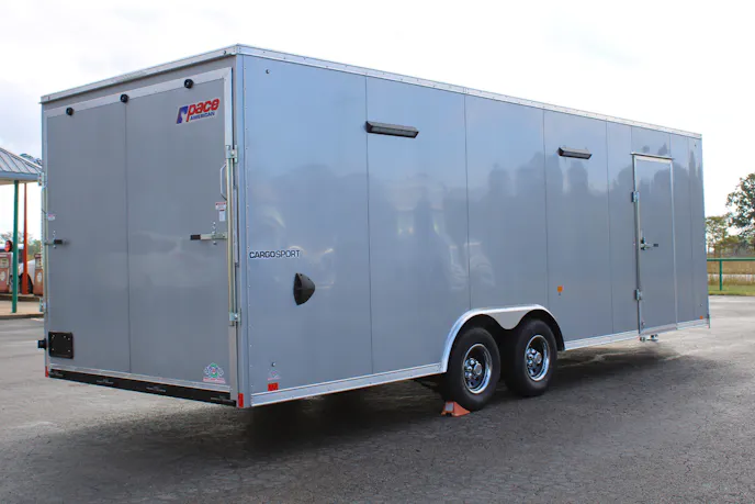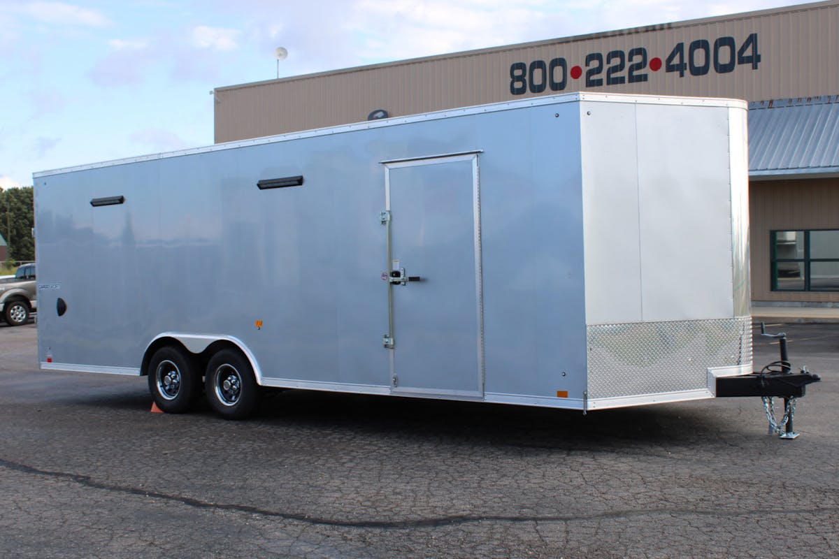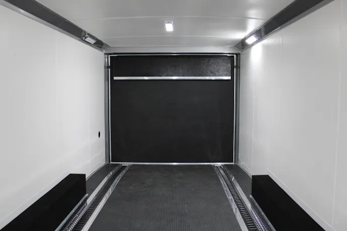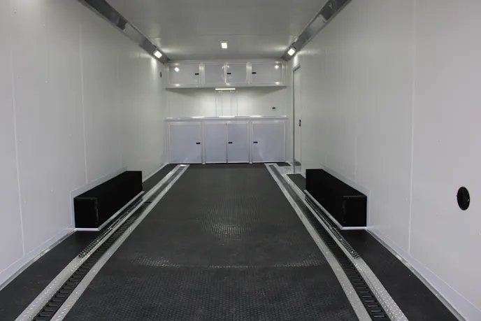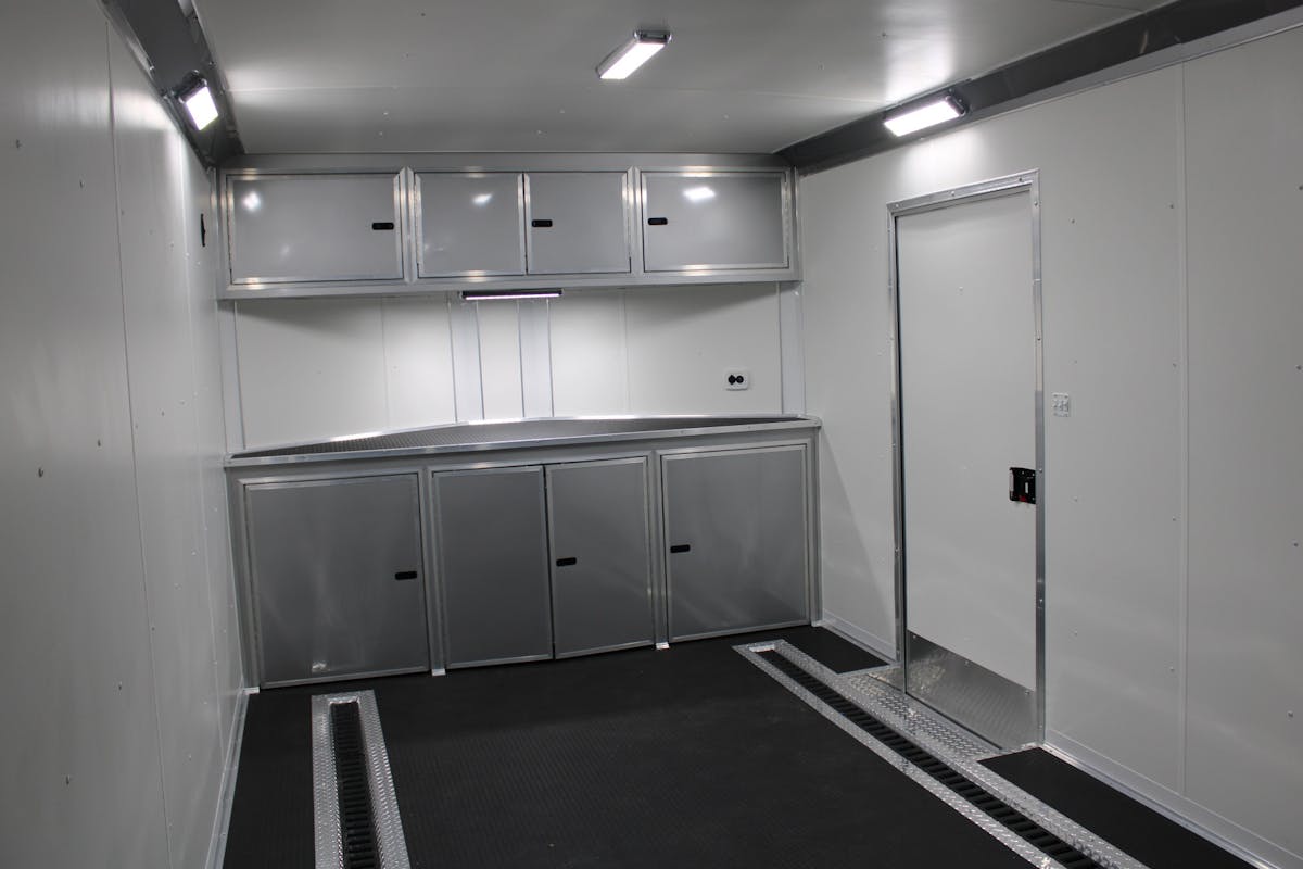 There is a wide 36-inch side door, a .030-inch screwless aluminum exterior, and LED exterior lighting on the outside. This is a solid trailer package full of features for the enthusiast to make highway hauling and race day enjoyable.