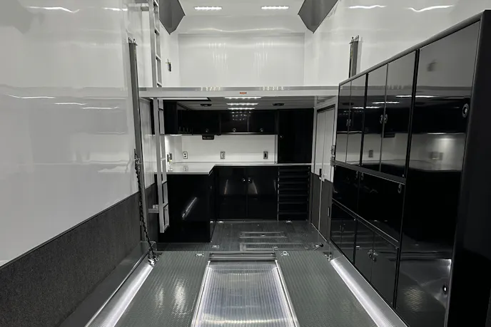 On the inside, the brilliant white aluminum interior walls and ceiling reflect well from the LED lighting throughout. Above the workbench area of the trailer is a second-story storage accessible by a ladder or the lift. There are two 8-foot overhead cabinets, two 8-foot workbenches, a large wheel well cabinet system, and a crew chief station with seven-drawer tool storage.