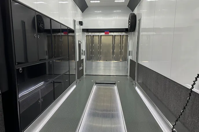 The 2023 inTech 32-foot trailer has an 11-foot, 4-inch interior height with an integrated rear ramp door that offers a 5-foot ramp flap. You can easily roll your race cars between two-level lift storage. The ramp door, elevated floor, and trailer floor are constructed with extruded aluminum.