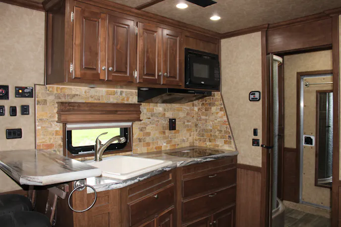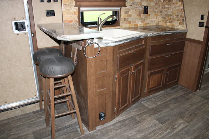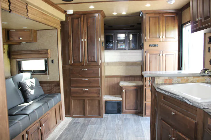 This 2019 model, 42-foot Sundowner gooseneck features 17-feet, 9-inches of vehicle storage — enough to fit many racecars and muscle cars — and full living quarters, including an 8-foot slide-out, a kitchen with sink, stove, microwave, and refrigerator, along with a master bedroom, toilet and shower, and a couch in the living room area. The cargo area is also equipped with a removable bunk to sleep additional family and crew.