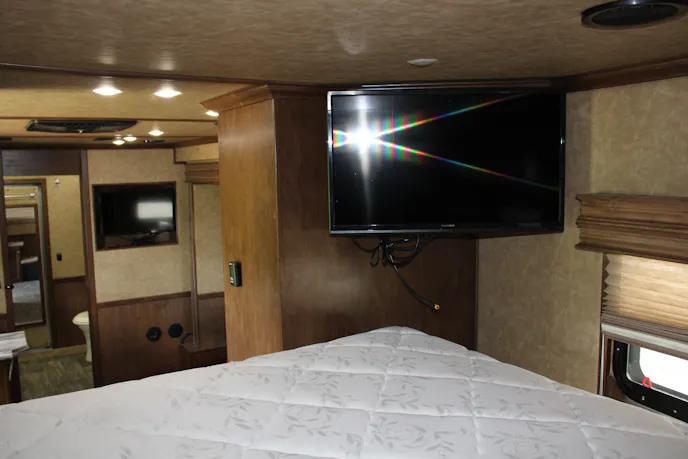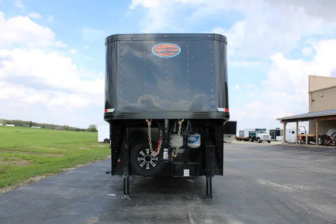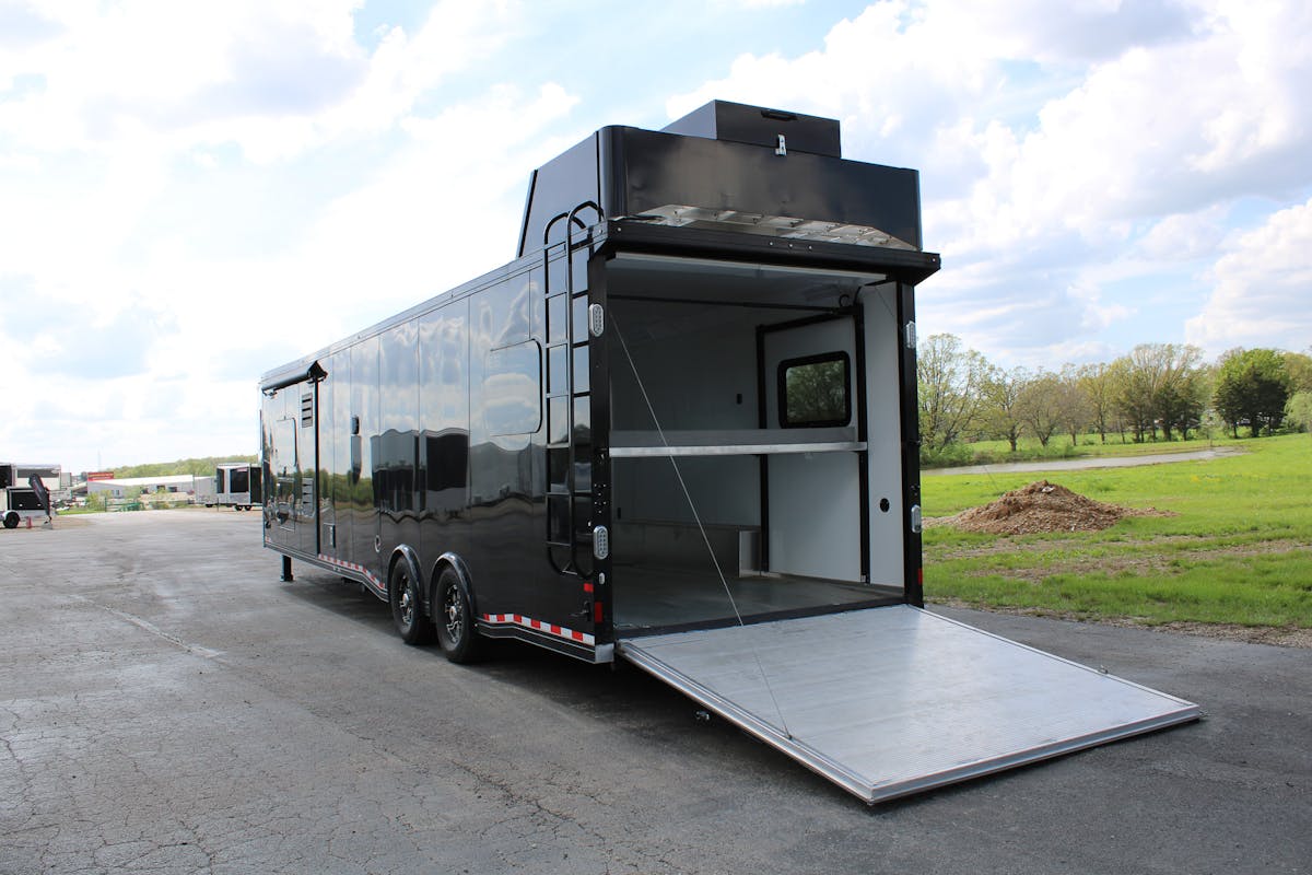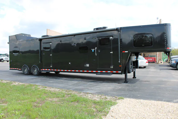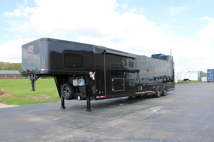 The tandem spread-axle rig sports a number of great operational and exterior features, including an electric awning, 50-amp electrical package and 110-volt exterior battery, dual hydraulic jacks, a 15,000 BTU A/C unit, a roof-mounted Onan 5.5 kW generator with access ladder, and more. The blackout package with a screwless aluminum exterior and tapered nose also gives the rig a great look going down the highway or parked at the racetrack or campground.