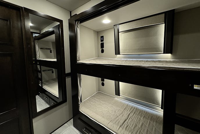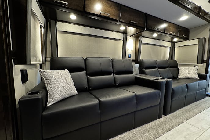 Sleeping arrangements are covered by a pair of bunk beds with their own TVs. You also have a bunk over cab bed, and the two sofas can turn into beds. In the rear, you’ll find a king-size bed in the master suite. A full mid bath in the rig is spacious and features lots of tile. The full rear bath has a sizeable vanity, tile accents, and a fold-down shower seat.