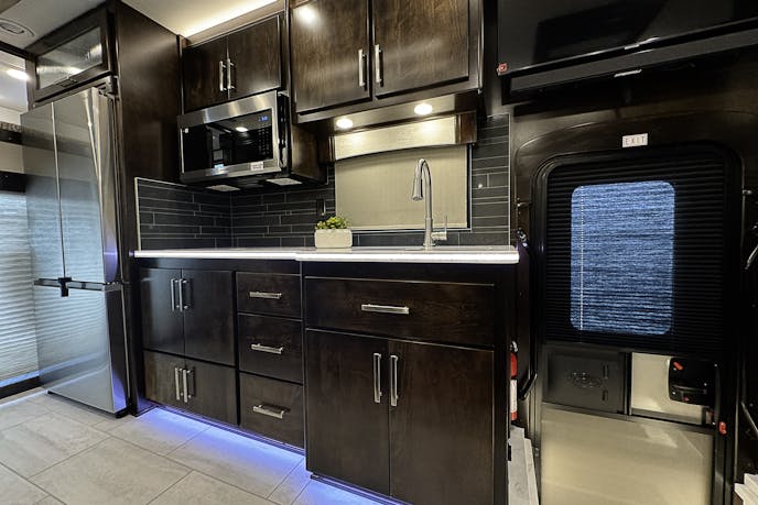The kitchen of the rig has solid surface countertops and a tile backsplash. Food is housed in a side-by-side residential refrigerator with a freezer drawer. You also get a large convection-style microwave and a two-burner induction cooktop stove. The rig also has a washer and dryer stack, along with a central vacuum system.