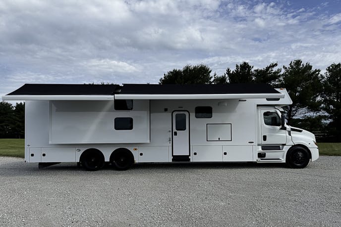 The 45CBF Renegade conversion of this rig has a pair of full baths, a mid-entry door, and can sleep up to 10 people. You can relax inside one of the two Ultraleather sleeper sofas and watch a movie on the 43” 4K Samsung TV. The porcelain tile floors are heated for extra comfort on those chilly mornings at the track.