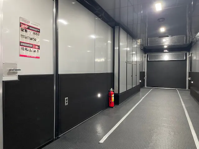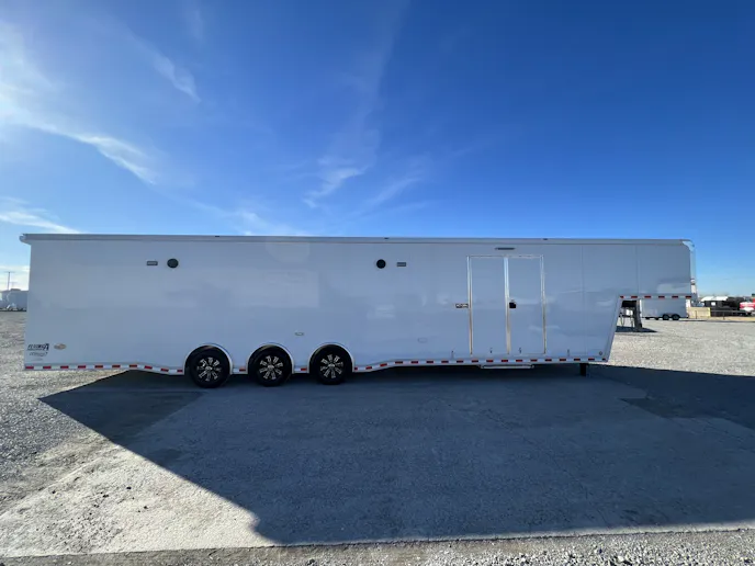 First, the 2024 Bravo Silver Star 44-foot Gooseneck Aluminum Icon trailer is built for durability and functionality. With triple 6,000-pound axles and a sleek .040-inch screwless white aluminum exterior, this trailer ensures reliable performance and a striking presence on the road. The interior boasts a .030-inch screwless silver aluminum finish, complemented by upper cabinets with top-hinged doors in silver with black trim.