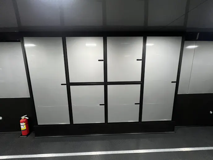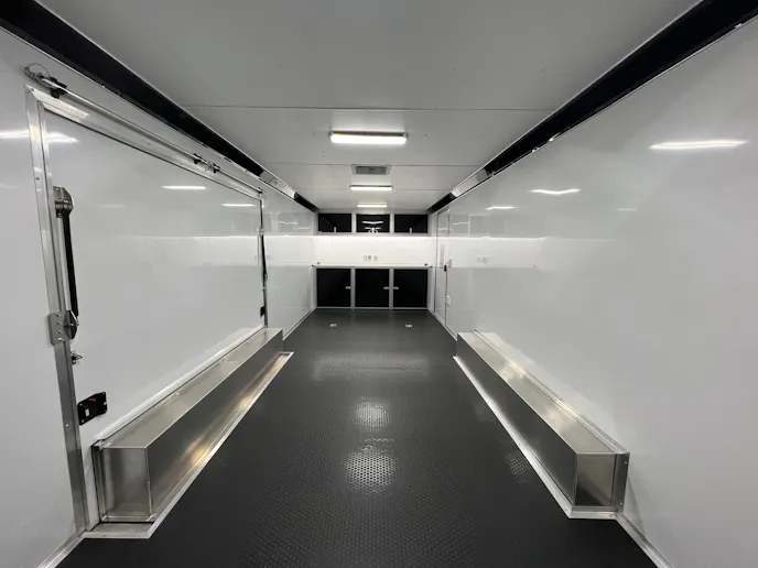 The practicality continues with a base cabinet featuring a mill finish workbench top and a seven-drawer toolbox, all in silver with black trim. The 44-inch fold-up workbench, wall-mounted TV, and mounted strap hanger add convenience. Safety features include a mounted fire extinguisher, while the black coin rubber floor and ramp ensure a secure workspace. With a 96-inch wide ramp door, recessed airline track, and double side entry door with an aluminum slide-out step, this trailer is tailored for efficiency.