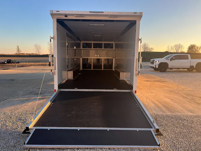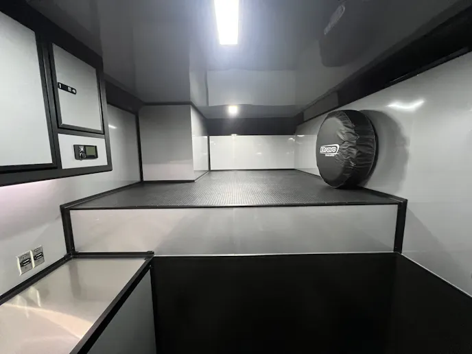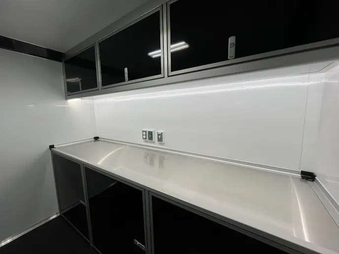 You can illuminate your workspace with an LED light strip under the overhead cabinet. The black coin rubber flooring, ramp, and ramp extension ensure a secure environment. Additional highlights include a 36-inch side entry door with an aluminum slide-out step, a 48-inch beavertail, spread axle for enhanced stability, black aluminum wheels, LED surface mount lights interior and exterior, a roof vent braced and wired for A/C, four 5,000-pound recessed D-rings, and a 5,000-pound tongue jack.