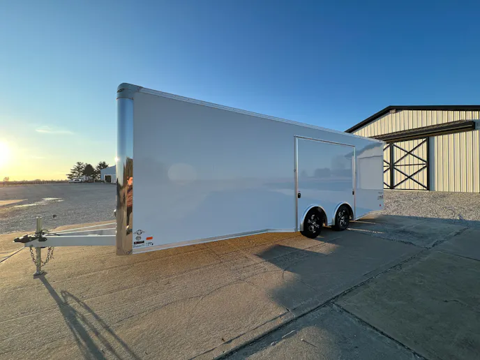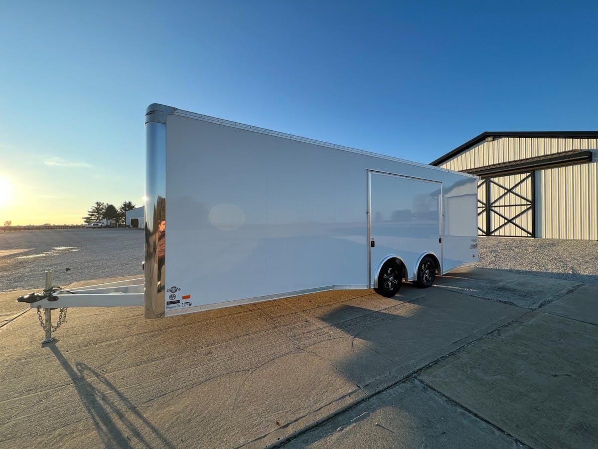 The 2024 24-foot Bravo Aluminum Silver Star with a full access escape door is designed for unparalleled convenience and performance. Tandem 5,200-pound axles and a 7-foot interior height provide stability and ample space. The .040-inch white aluminum exterior and .030-inch white aluminum interior walls create a sleek and durable structure. Featuring a full-access escape door with a removable wheelbox (72 inches), a base cabinet in black, and overhead top-hinged cabinets in black, this trailer maximizes accessibility and storage.