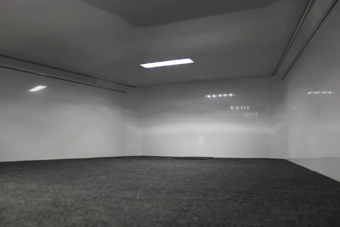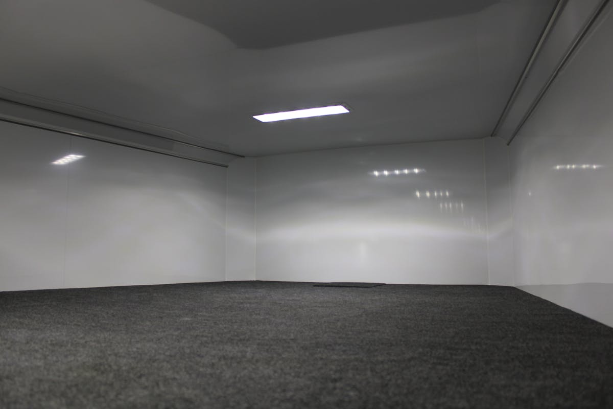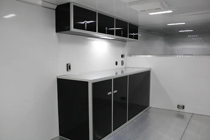 This brand new 2021 model trailer sports a number of upgrades, including a hydraulic single-post jack, a 21-foot Dometic Weathershield power awning, a 15,000 BTU Low Pro roof-mount A/C unit and wall-mounted thermostat, extruded aluminum floor, and a 48-inch side entry door. There are also black floor and wall cabinetry leading up to the carpeted riser.