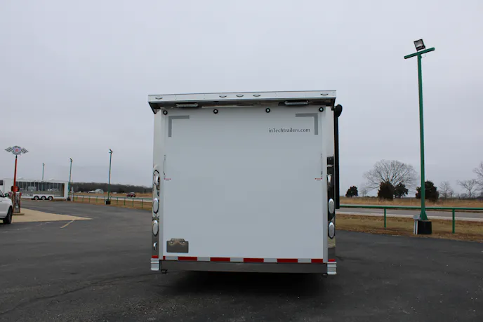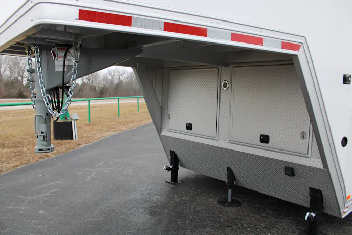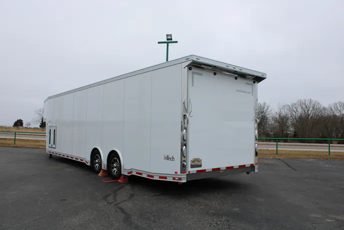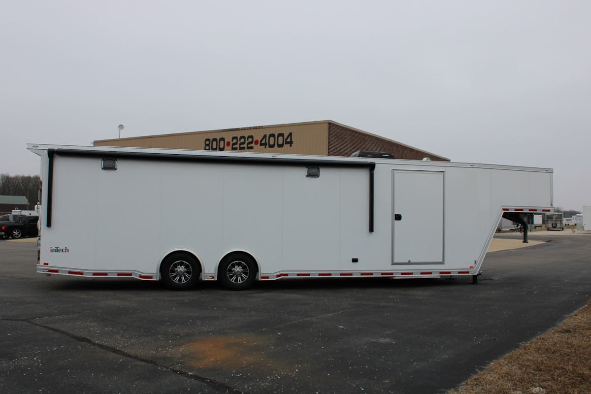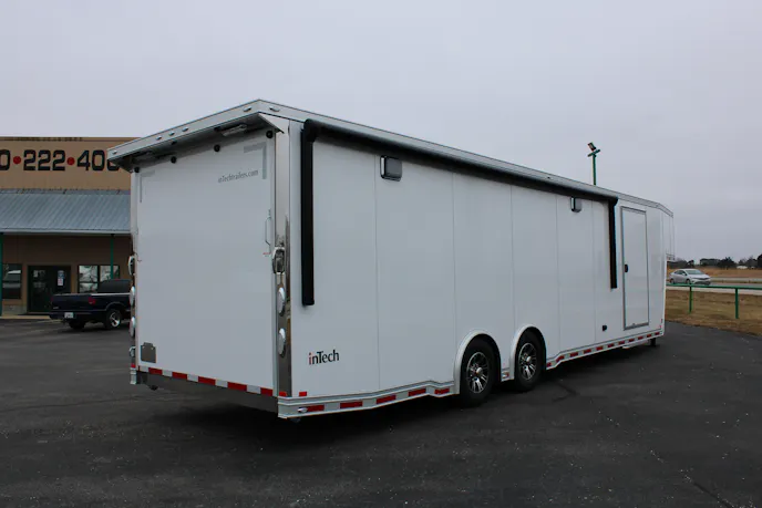 Trailer manufacturer InTech produces one of the industry’s finest race rigs, and this 38-foot gooseneck is no exception to that. InTech builds it trailers using custom engineered, all aluminum, all tube frames, and the features keep on rolling from there, including electric brakes, aluminum wheel boxes, dual-leg landing gear, a subfloor vapor barrier, a screw-less aluminum exterior and one-piece roof with a walk-on trussed construction, LED exterior lighting, and plenty more.