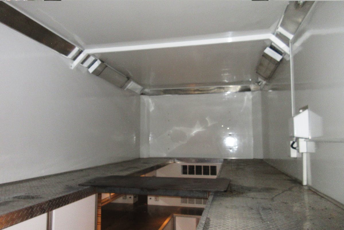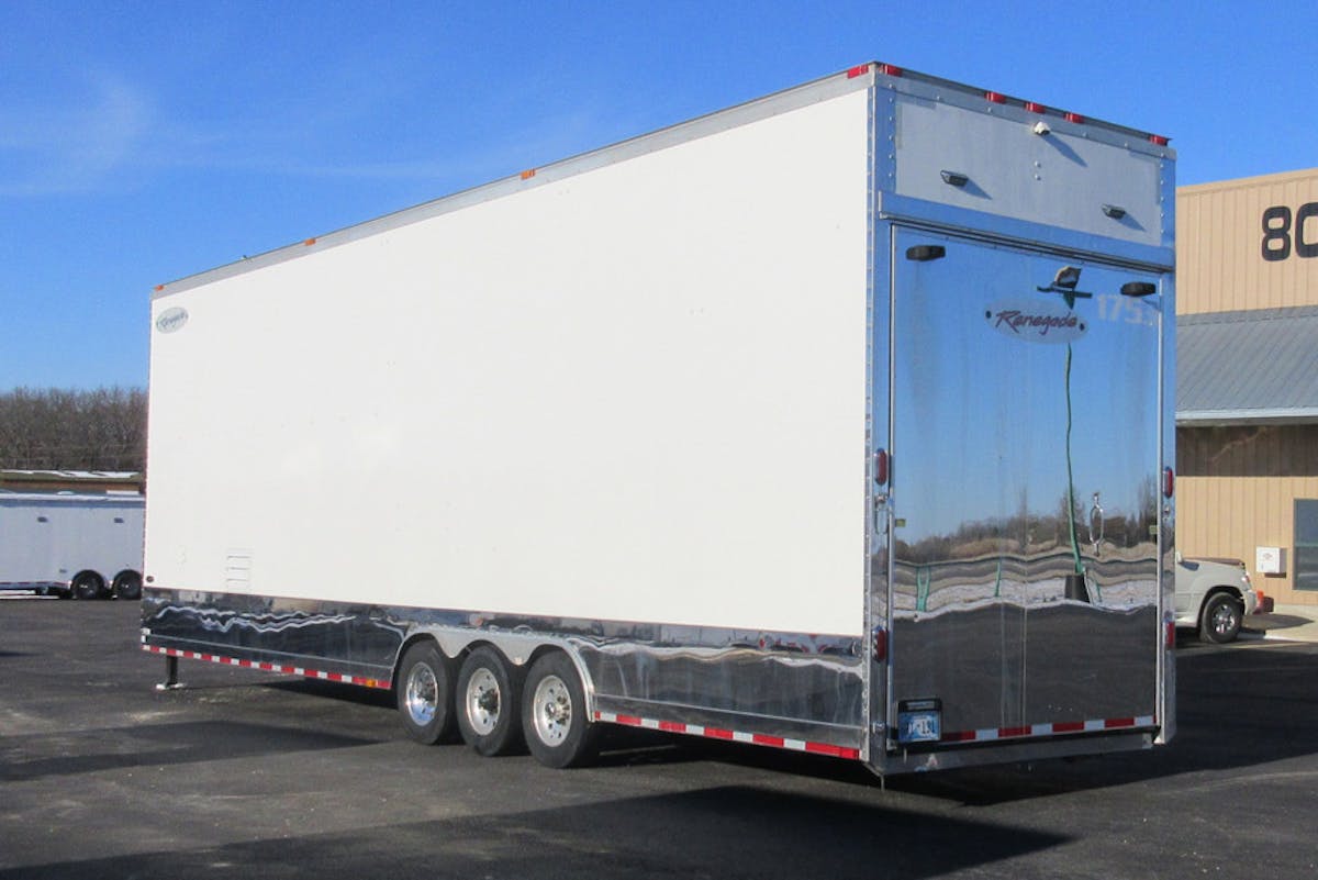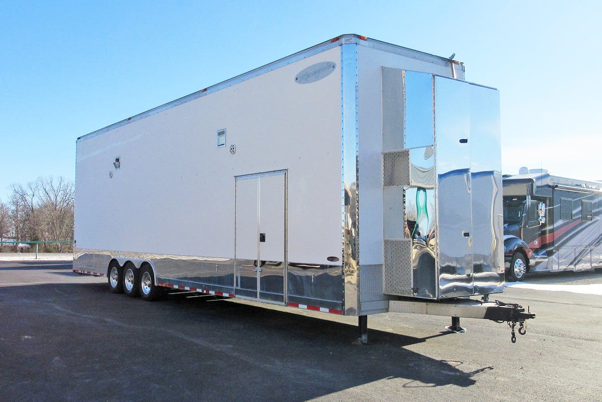 In the heavy-duty hardware department, the trailer is equipped with triple 10,000-pound torsion axles, a 13-foot interior hydraulic lift, and a 9-foot x 88.5-inch ramp rear door.