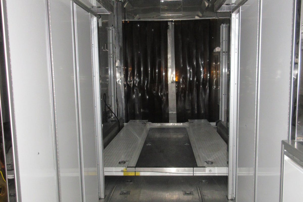 The trailer is equipped with a 13-foot hydraulic lift and an additional 18-foot upper deck storage area. This will possibly accommodate a total of three cars or a wealth of spares and pit vehicles.