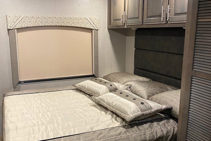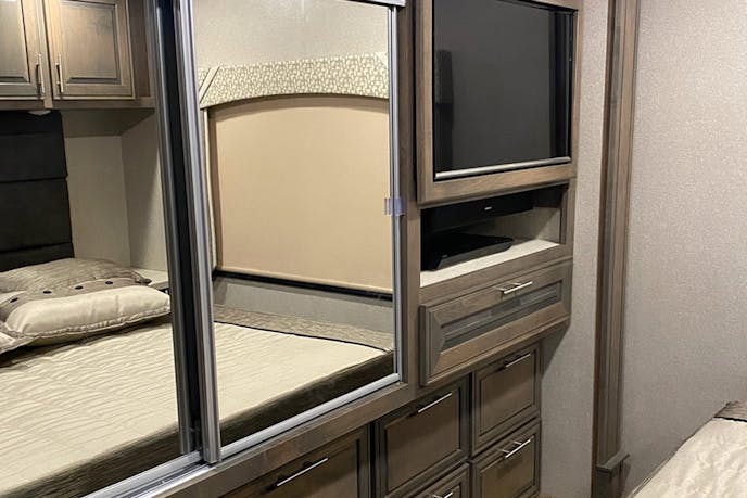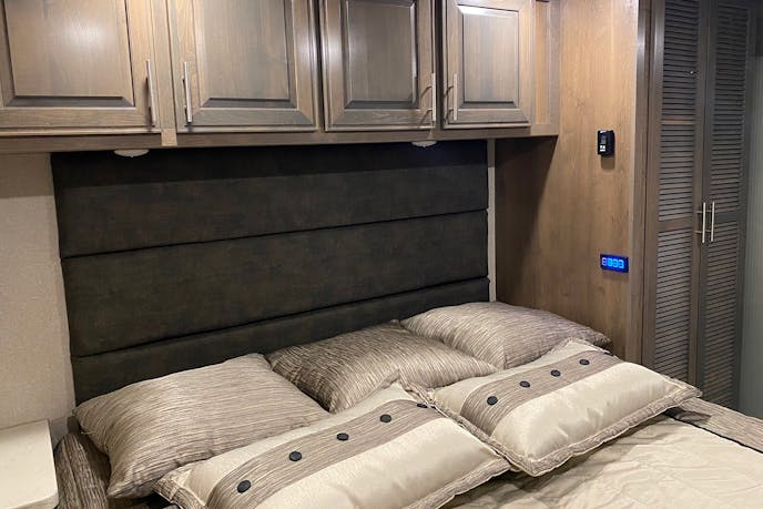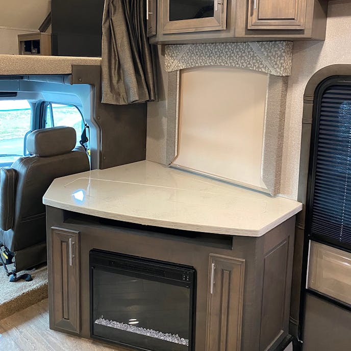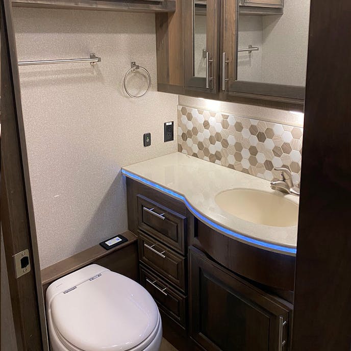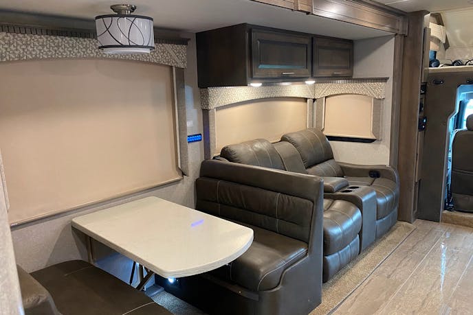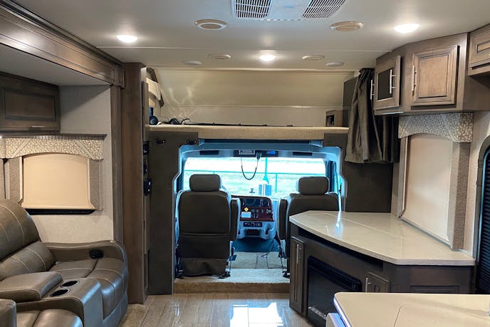 Within the cab area, there are leatherette driver and passenger air-ride seats with swivel bases. There are also backup and side-view cameras along with a Mobileye Collision Avoidance System. The driver can get serious with an in-dash Garmin RV navigation system while enjoying life with a Kenwood 7-inch touchscreen infotainment unit connected to a JBL Premium cab sound system.