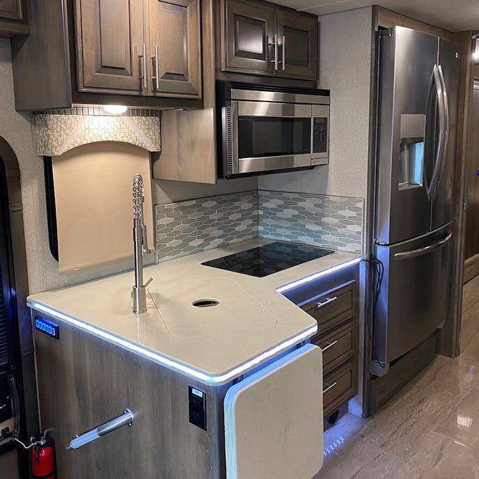 “The kitchen area is very nice; it has a 22-cubic foot residential refrigerator, induction range and convection microwave oven,” Cape says. “The solid surface countertops have a hand-laid tile backsplash and double bowl stainless steel sink.”