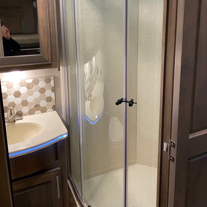 The comforts continue with an Aqua-hot diesel water heater system with engine pre-heat. Included is an exterior shower in the service bay area along with an upgraded 12-volt on-demand water pump that puts out four-gallons per minute of volume.