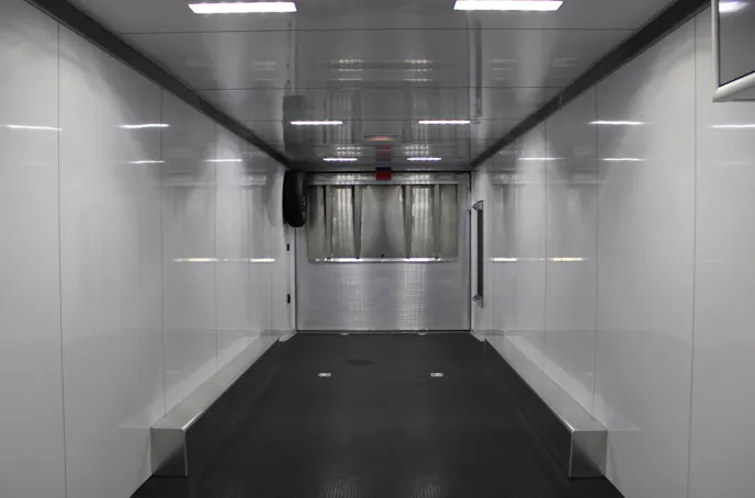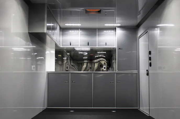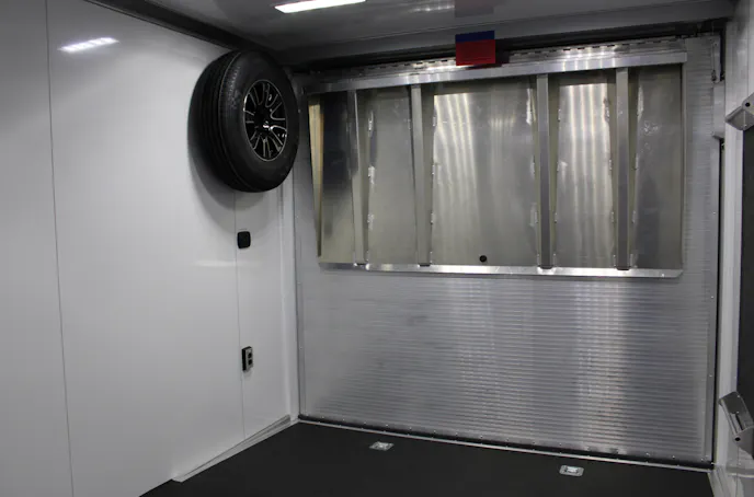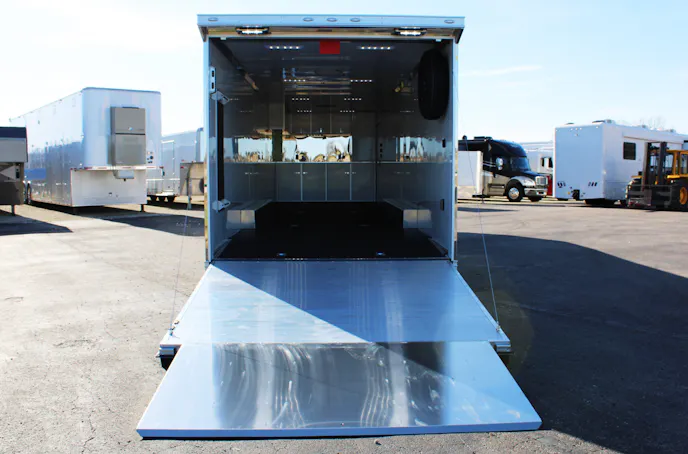 The interior features inTech’s screwless aluminum walls and ceiling plus an inTech cabinet package. The floor is covered with black coin rubber flooring, and the 97.5-inch extruded aluminum rear ramp door is an upgrade.