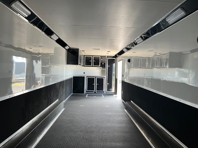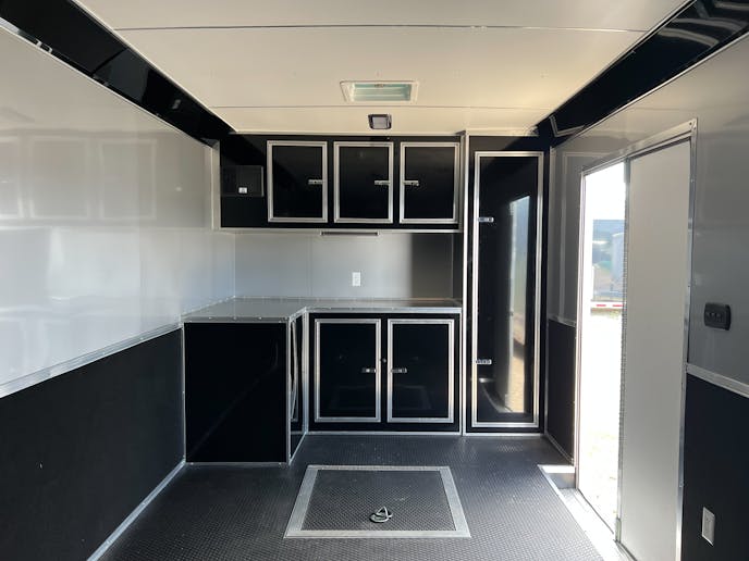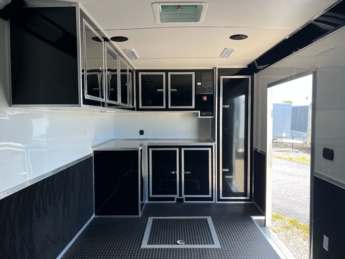 Inside, you’ll find an L-shaped base cabinet and overhead cabinet for ample storage. The upgraded full-height closet ensures your gear is organized and readily accessible. With black cabinets and cove, along with 36-inch wainscot carpet, the interior exudes a sense of luxury and style.
