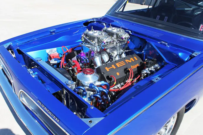 The ultra-clean exterior of the car comes compliments of a House of Kolors ‘True Blue Pearl’ paint job completed by S&D Enterprises, covering the fiberglass lift-off hood and oversized Hemi hood scoop and is set off by freshly polished and/or chrome trim pieces, including the bumpers, door handles, and window lips.