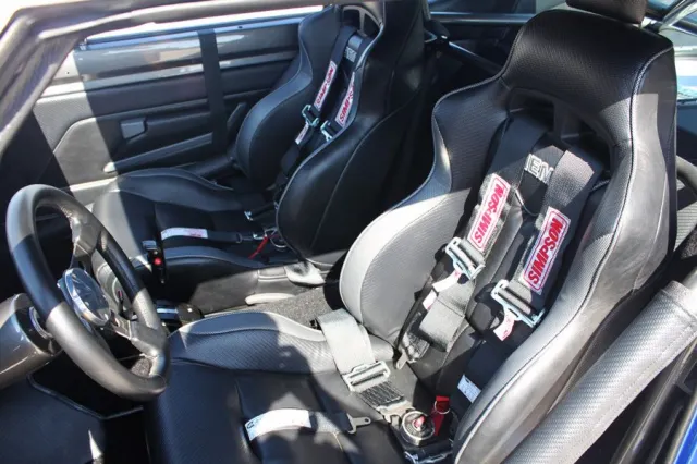 Inside is an all custom, carbon fiber weave interior, with carbon fiber-look Auto Meyer gauges to match, along with late model Dodge Viper seats, Simpson five-point Cam-Loc belts, and a full stereo system, even including a subwoofer box.