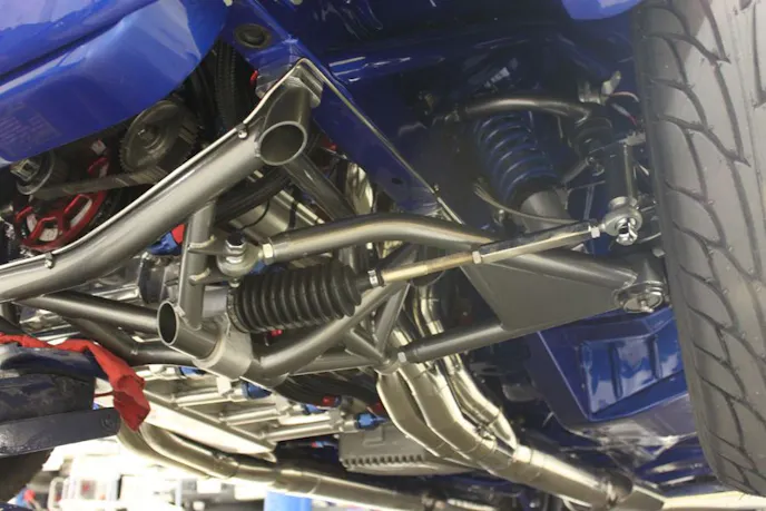 A full, custom polished exhaust setup was built to make the car adequate for street and strip duty which, complete with polished Borla mufflers, exit out through the sides just forward of the rear wheel opening.