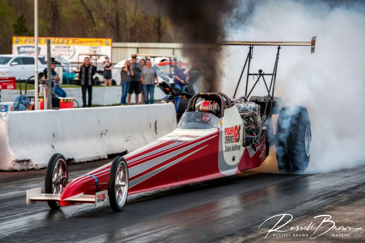 Not of the ordinary gasoline, methanol or nitro variety – Robinson’s Power Service Diesel Additives-backed dragster utilizes a 390-cubic-inch Cummins Diesel for power. The Weatherford, Texas, driver’s hunting efforts were rewarded as he recorded the quickest 1/8-mile elapsed time with a 4.10-second pass at 181 mph at the recently completed Funny Car Chaos Texas Nationals at Pine Valley Raceway near Lufkin, Texas, on an exhibition pass.