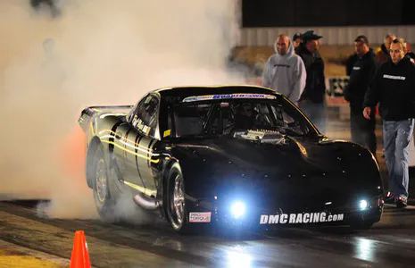 On Friday evening, the final car down the race track as Outlaw Drag Radial standout Paul Major, whose Corvette had just undergone some turbo relocation work at DMC Racing in the days prior to Shakedown.