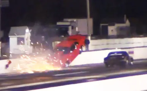 Sterling’s GTO struck the wall passenger side first, then pirouetted into the air before bouncing and rolling several times end over end. The battered car eventually came to a rest on what was left of its four wheels and Sterling emerged unhurt, but it was certainly a few tense seconds as the crowd watched the accident in horror and awaited confirmation from the other end of the race track.