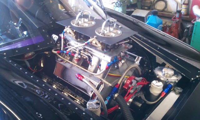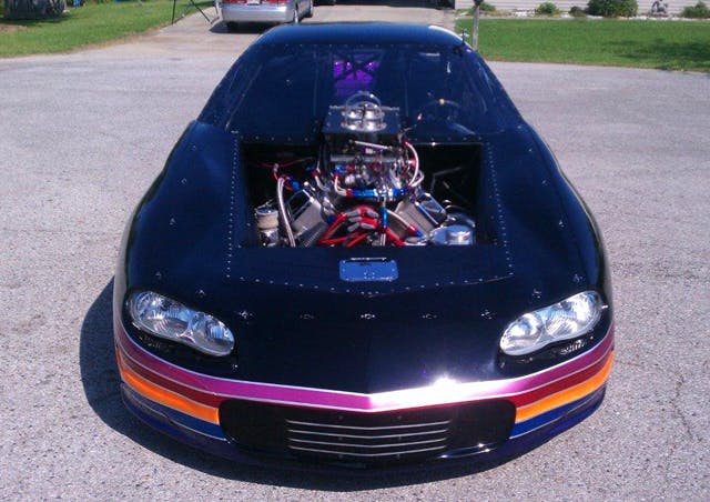 The Camaro was bought complete as a “turn key” racecar but Ronnie wanted to change a few things. He and the crew added a new Powerglide transmission with a 1.80 first gear, a Neal Chance 4000 stall converter, and swapped the ring and pinion for a set of 4.10’s. Other changes include switching from a dual battery setup to using only a single 16volt battery, and moving the fuel cell and pump out of the trunk to the front of the car. And for some added safety, a second parachute was added. With all changes considered, the new race weight of the car and driver is now just 2,470lbs.