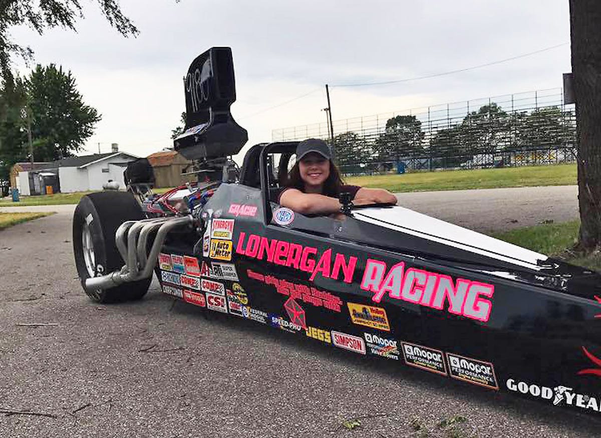 Gracie has clocked a number of laps in her 5-second (1/8-mile) dragster already this season, but none quite like the one she took on Sunday at Cedar Falls. With the relatively narrow rear end of her dragster, she and her father said it’s necessary to choose one side of the racing groove, but that the car won’t fit within the rubber footprints laid down by the wider door cars. While Gracie believed her position to the right of center in the groove initially led to her dragster losing traction and sashaying out of control and ultimately onto its side, after some time to reflect, the Lonergan’s feel the strong winds simply got ahold of the car.