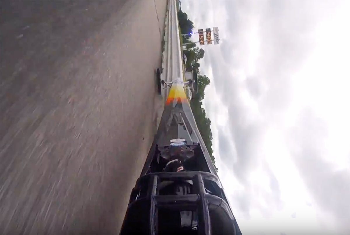 In what can only be described as an impressive job of driving, a significant stroke of luck, and perhaps a bad job of crashing, Gracie’s dragster turned onto its left slide, struck the concrete retaining wall with its underside, and then gracefully turned back onto its wheels as if nothing happened at all.