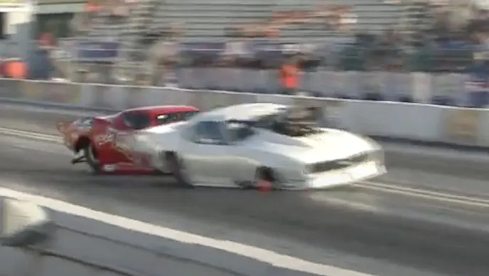 In the opening round of eliminations, Merick and Phillips were racing alongside one another in the left and right lanes, respectively, when Merick’s 1979 Corvette crossed the centerline and struck the driver’s side of Phillips’ 1968 Camaro; the unintended contact sent Phillips and his “Big Nasty” machine up on two wheels as he put his driving talents to work to save his racecar. Merick, meanwhile, was putting on a show of his own, as the Corvette spun more than one full revolution and slid to a stop in Phillips’ lane. Amazingly, despite the contact at such a high-acceleration part of the run, neither driver so much as scraped a guardrail and each incurred only minor body damage. Phillips, the winner by way of the first-or-worst rule, returned in the next round but fell to Frankie Taylor.