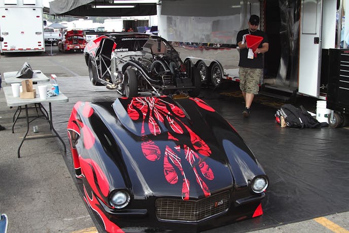 Just six weeks after crashing his gorgeous twin-turbo Mustang at the NMCA West Bakersfield race earlier this season, Scott Oksas was back in action this past weekend at the Lucas Oil NMCA West Coast Shootout in Pomona. The car is a ‘70.5 Camaro Chris Duncan Race Cars chassis purchased from fellow racer Mike Maggio, and Oksas moved quickly after his mishap in Bakersfield, picking up this car and outfitting it with five-second performance potential in no time. The car runs a Brad Anderson Engineering 521 cubic-inch HEMI engine backed by a Rossler transmission and Pro Torque converter, and a pair of Precision turbochargers help to provide the motivation for low six-second elapsed times on the track.