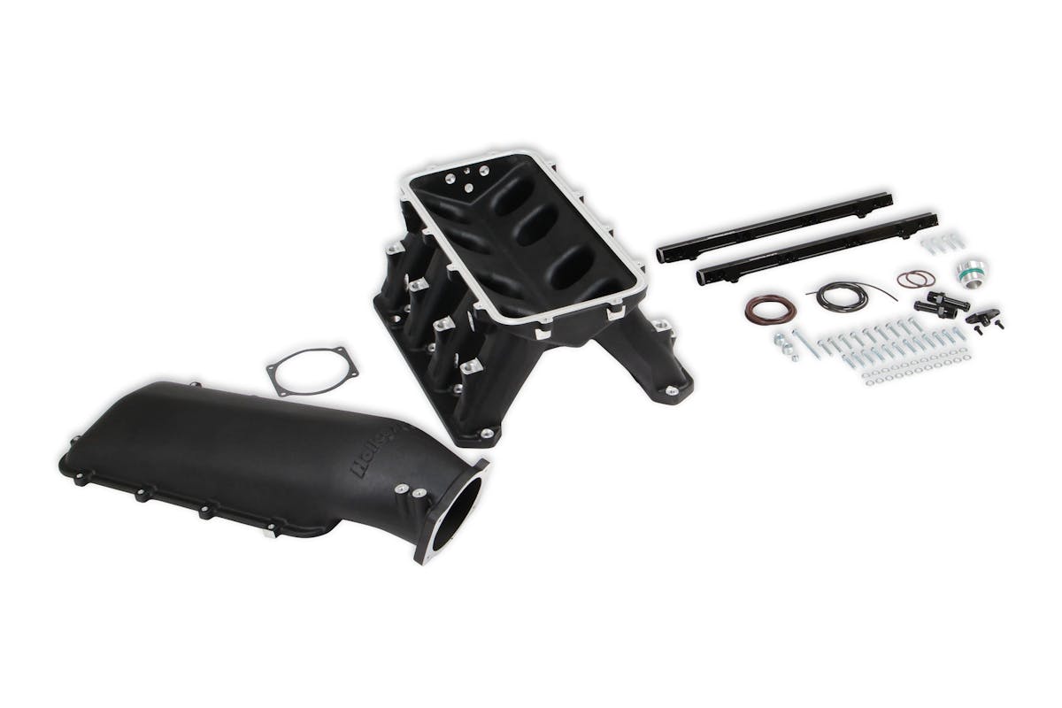 Since the Hemi Hi-Ram intake uses large intake ports, it has greater flow and will maximize what a set of Gen III Hemi cylinder heads can do in a naturally aspirated or forced induction application. This increased performance is thanks to the runner length and tapered cross-section design that Holley decided to use with the Hemi Hi-Ram intake. To make the Hi-Ram intake more versatile, Holley made sure that Gen III Hemi injectors and Bosch EV-1 style injectors would work with the intake.