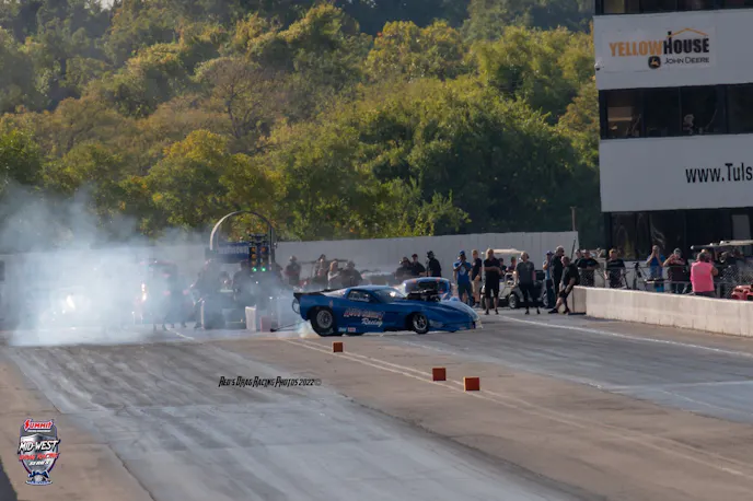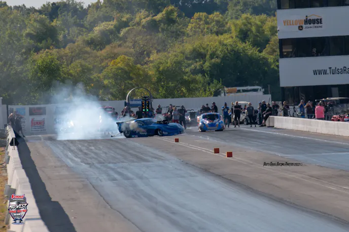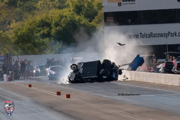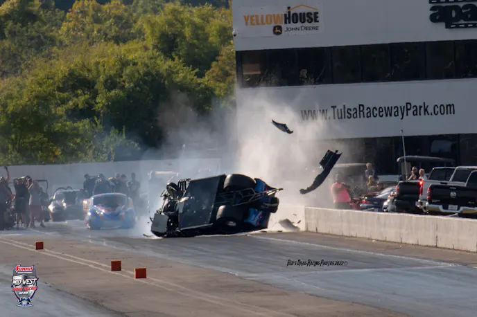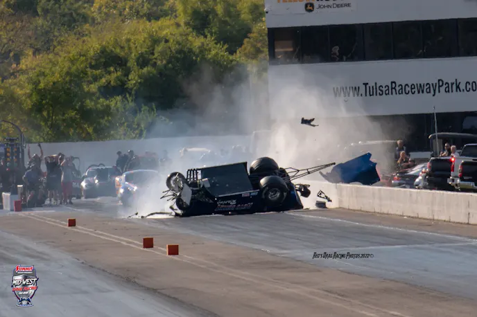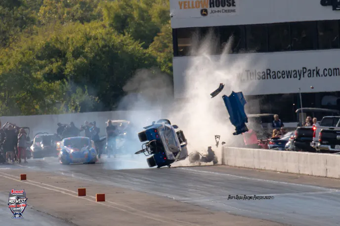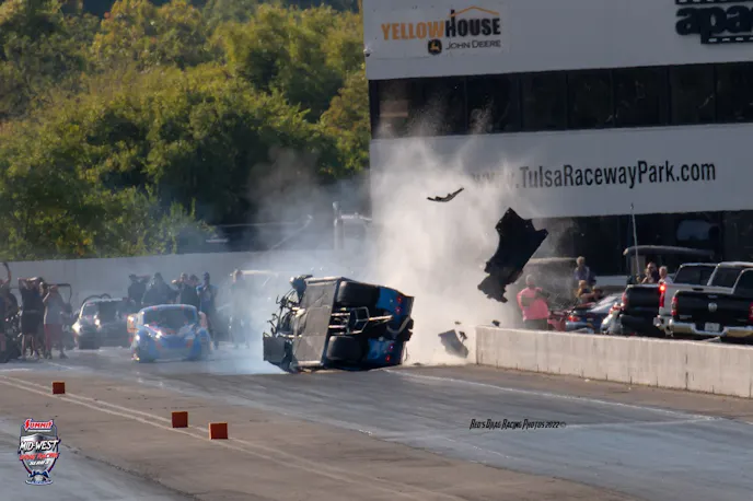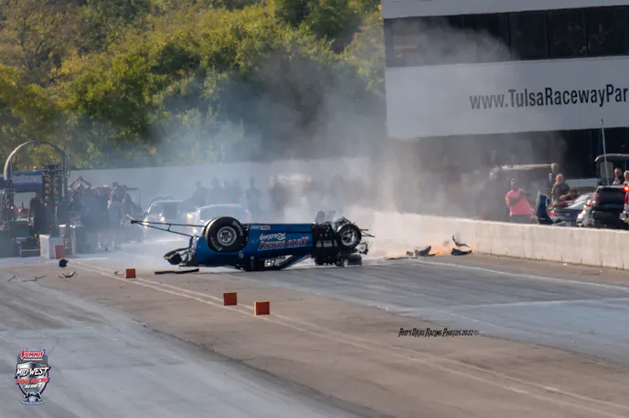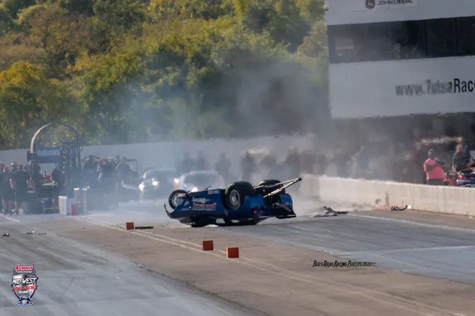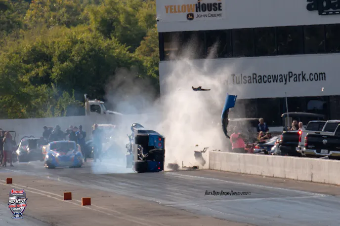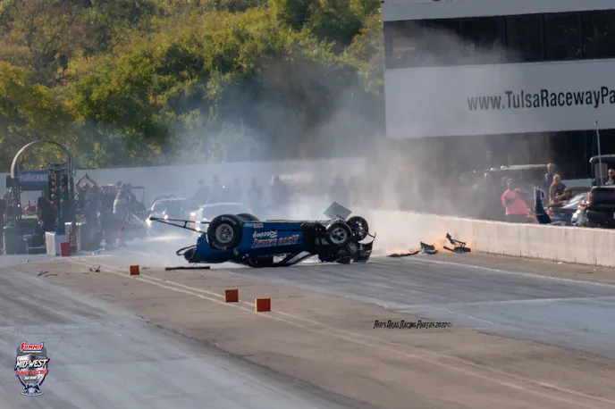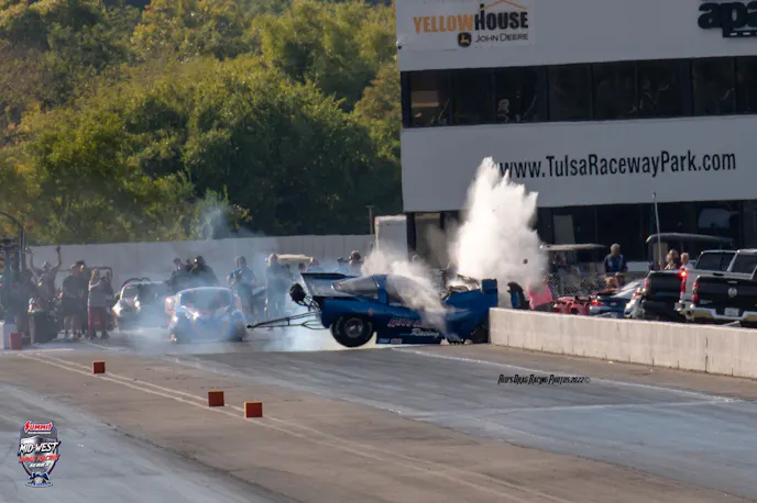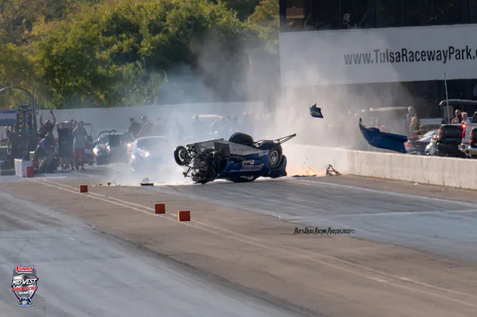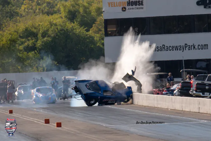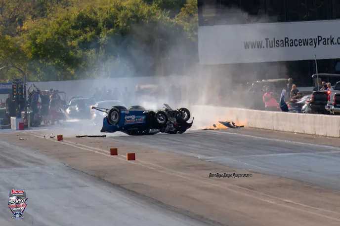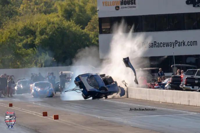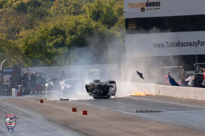 Pro Modified racer Wayne Roberts, of Valley City, Kansas, was uninjured in a frightening on-track accident at the Throwdown In T-Town at the Tulsa Raceway Park in Oklahoma. Roberts, in his supercharged Corvette, was competing in the Great Bend, Kansas makeup race, as part of the Mid-West Drag Racing Series, when he lost control just off the starting line and shot across the racetrack, striking the wall head-on near the 200-foot mark. The impact spun the car around and onto its roof, where it came to a stop in the center of the racetrack. Roberts was transported to a local hospital for evaluation, and returned to the racetrack the following day.