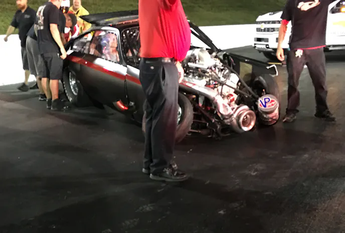 McAlary, who has really turned up the threat-level on the streets and has been a consistent late-round finisher at the handful of no prep events he’s taken part in this year, crashed his world-famous Vega in the semi-final round of eliminations at the $100,000, invitation-only Street Outlaws filming at the Bristol Dragway on August 22nd. MacAlary was racing fellow 405 runner Justin “Big Chief” Shearer when he got out of shape near mid-track, spun around and struck the concrete guardrail nearly on his side, facing back in the direction he came.