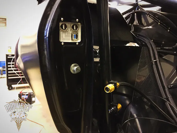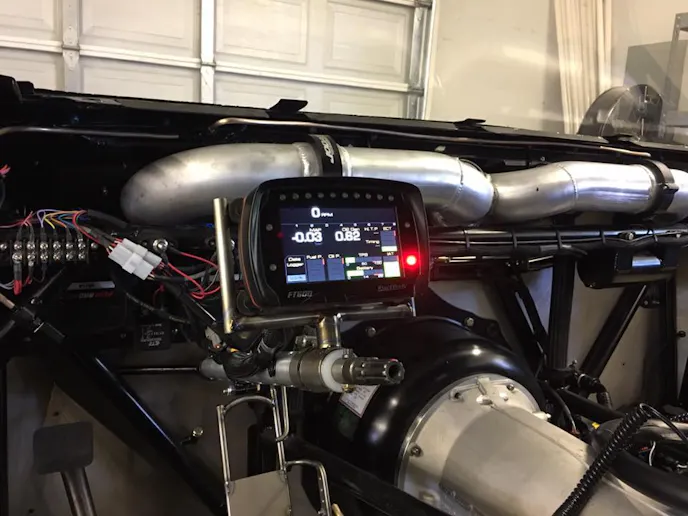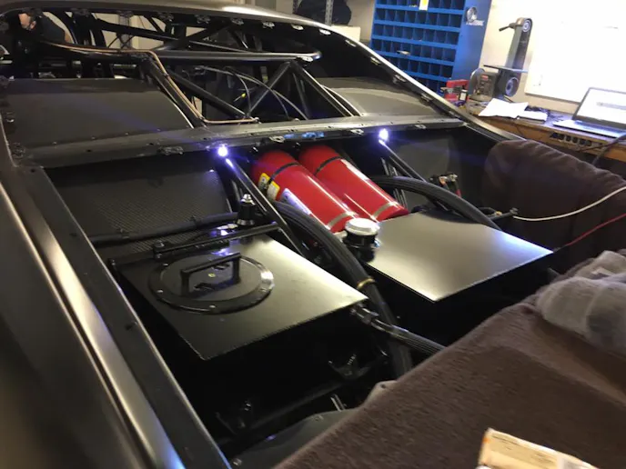 Fabricator Travis Quillen at Quillen Motorsports Engineering in Alabama has been working meticulously to complete the wiring and plumbing work, and the details he’s included are pretty slick, to say the least. In addition to the super-clean routing of the wiring and plumbing throughout the car’s engine bay and interior, you’ll notice the addition of a writing panel on the passenger side door jam to connect a computer or handheld tuner via serial port or USB to access the ECU (Shawn is running FuelTech’s brand new FT600 in the car), along with the mounting of Jiffy-tite quick-connect fittings just inside the passenger door for convenient connection to a transmission cooler in the pit area. As Ellington pointed out, Quillen has also installed and neatly wired small LED lights in the trunk, the interior, and the engine bay to provide a light source for working on the car on those late nights of filming.