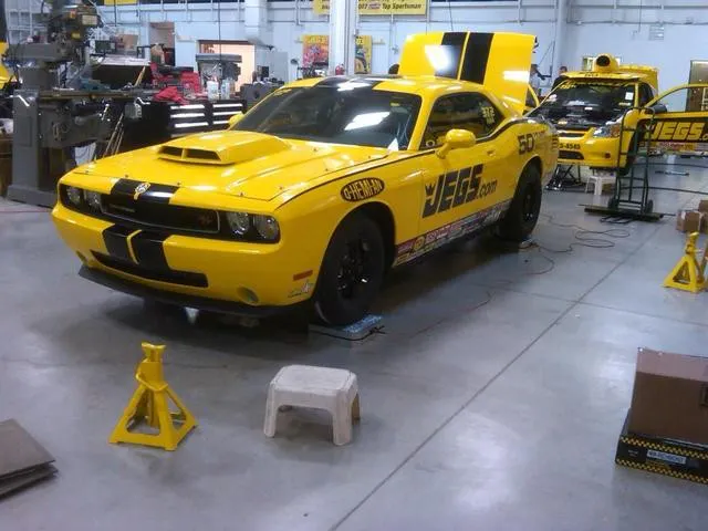 Part of the Drag Pak Challenger construction is the deletion of the rear spoiler, an automatic transmission is installed and out back the IRS was ditched in favor of a factory-type solid rear axle and a 4 link suspension setup that appears similar to what you’d find in a SRT-8 Jeep. The chassis and suspension work was done by John Holt Race Cars and the yellow Jegs paint we are all accustomed to seeing on their cars was done by Custom Motorsports Painting in Mansfield, Ohio. That’s all we know for now, we’ll enjoy these teaser pics until we get to see some on-track action in Pomona.