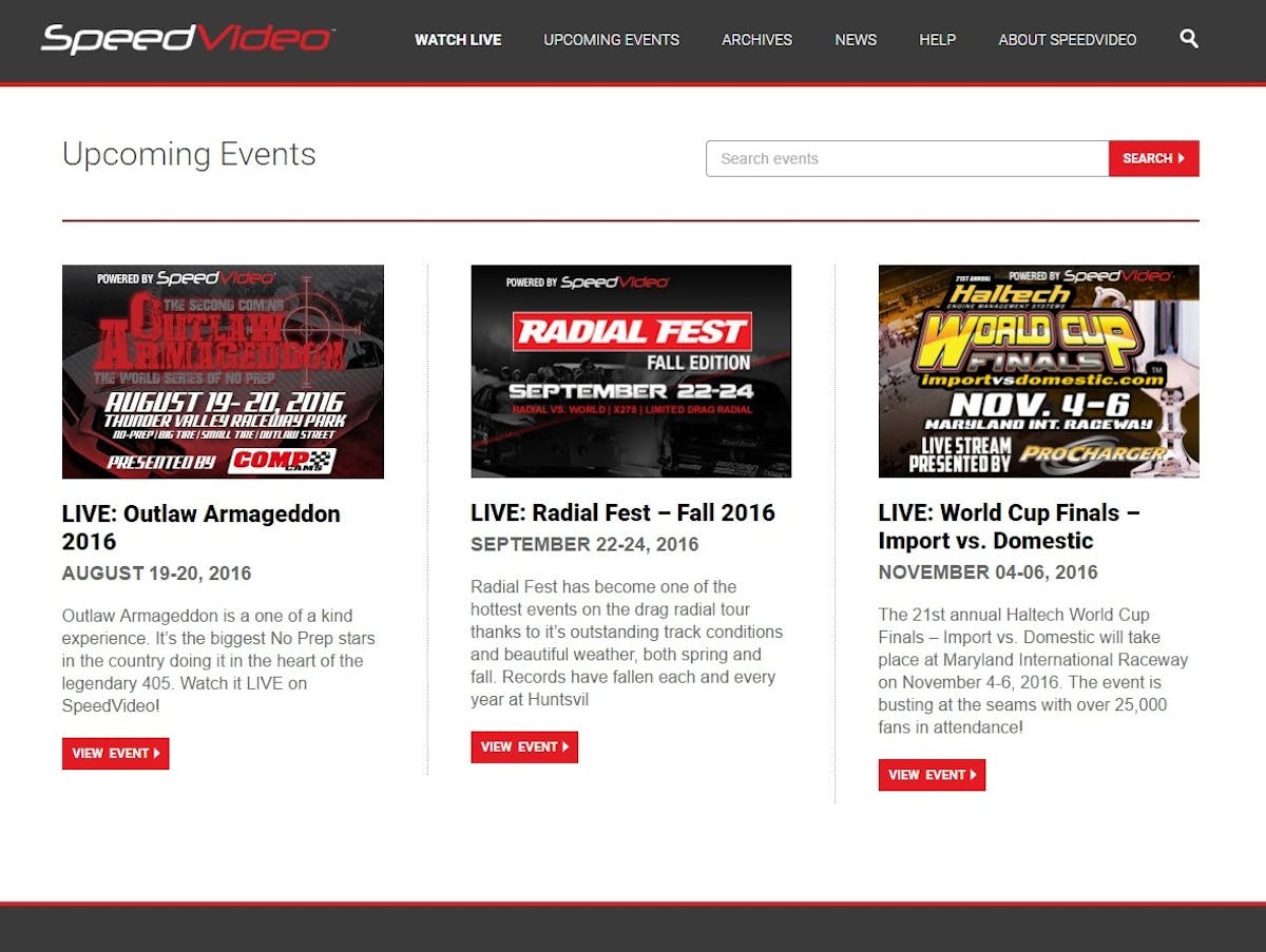 To help build a deep user experience, the SpeedVideo development team looked for ways to provide viewers the ability to see more than just the live event. “A section for news about our partnerships with event organizers for future events has been added to the site, so fans can see what’s on the horizon at SpeedVideo. An easy to navigate, on-demand section of all past events has also been added, so users can watch hours and hours of action, or just event highlights if they prefer,” Garcia says.