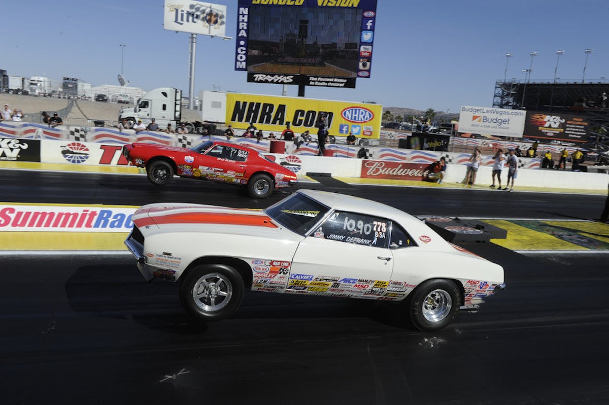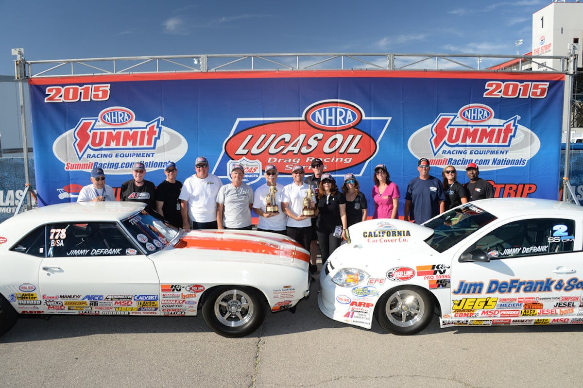 Jimmy DeFrank’s drive was unequivocally rewarded when he doubled-up at the 2015 SummitRacing.com NHRA Nationals at The Strip at Las Vegas Motor Speedway, taking home the trophy in both the Super Stock and Stock Eliminator classes for the second time in his career and earning wins No. 16 and 17. He defeated Brad Burton in the Stock Eliminator final and Les Norton in Super Stock.