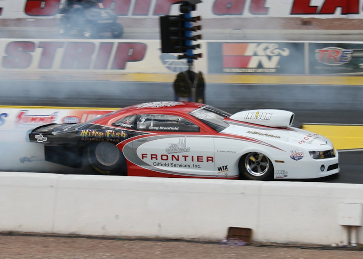 The debut of the new-age Camaro has been highly anticipated since it was announced that they were approved for Pro Stock and the first one to hit the track was purchased by Greg Hill, built by Jerry Haas Race Cars, and driven by Greg Stanfield. Stanfield’s Frontier Oil Services-backed Camaro was impressive in its debut, making it all the way to the semifinals in Las Vegas. The car took over a year to build and the project was started before NHRA even approved the body for it. The chassis had to be built from the ground up because the new body couldn’t just be slapped onto an old chassis. The team arrived in Las Vegas with an all-white shell that was beautifully wrapped by the guys at Fineline Graphics out of Denver, Colorado.