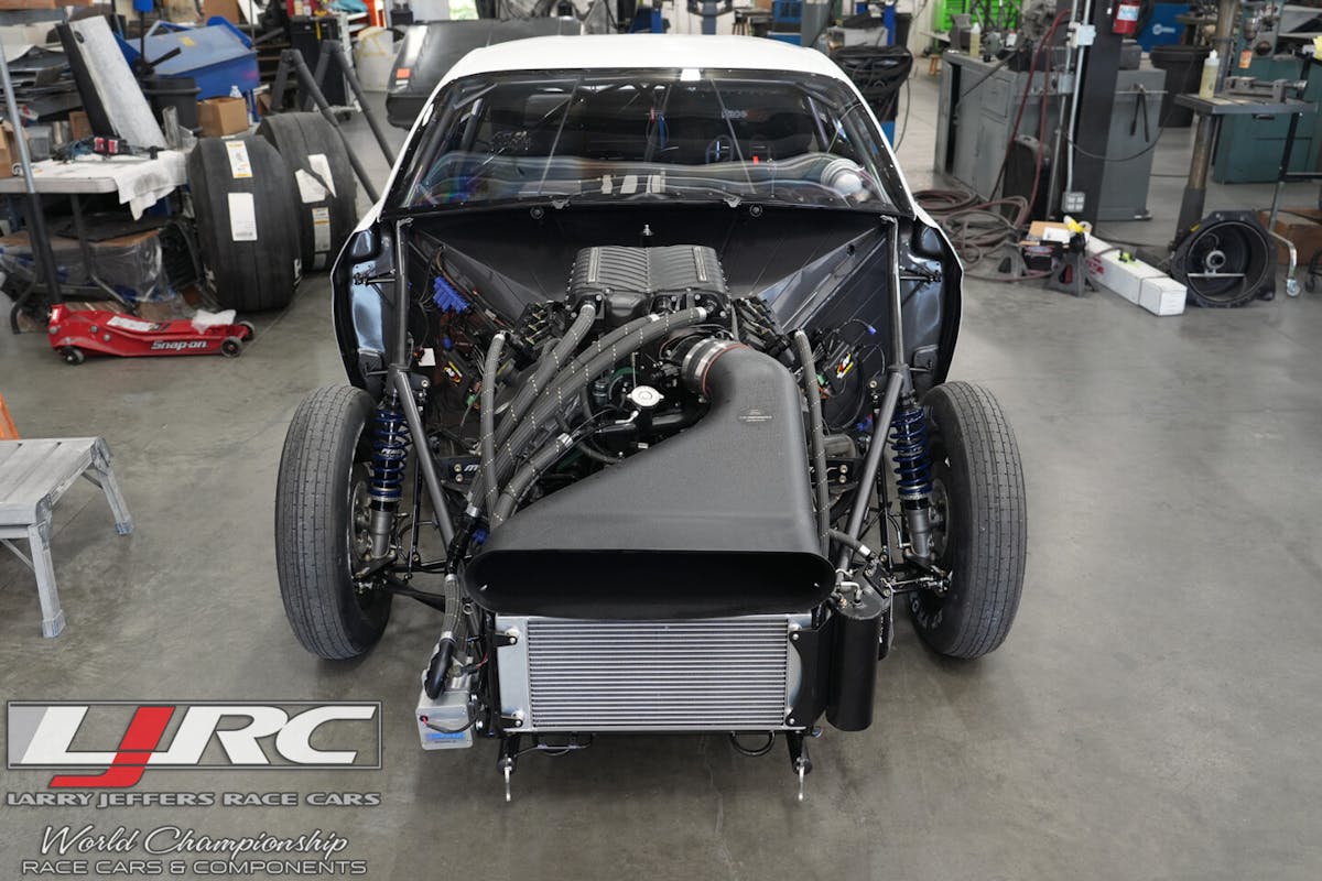The Factory X Mustang’s — this one joining Chris Holbrook’s car as the only Ford’s currently competing in the category — utilize a 327 cubic inch Coyote engine. These are production-style, 90-degree V-8’s with aluminum engine blocks and cylinder heads, featuring dual overhead camshafts and four valves per cylinder, with a bore and stroke combination of 3.7-inches and 3.8-inches, respectively. They are topped with 3.0L Whipple superchargers, and this one is backed by a Liberty five-speed manual transmission with a clutch.