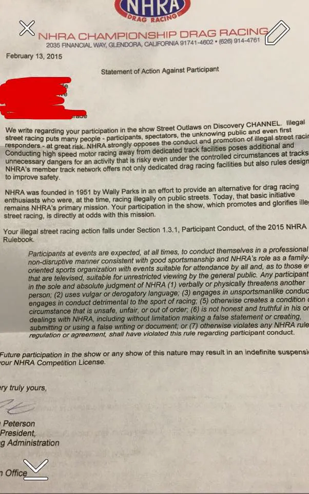 We have received news that several participants that either currently have NHRA licenses, or those that have applied for a license, will be denied, or have their license indefinitely suspended for either participating in the show, or inquiring about being on the show. The NHRA says such street racing puts “participants, spectators, the unknowing public, and first responders – at great risk,” according to a document from the NHRA.