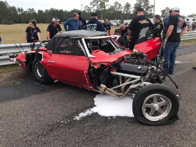 Poole, from Pascagoula, Mississippi, was racing in his familiar nitrous oxide-assisted 1964 Corvette when, in an incredible scene the likes of which the sport rarely sees outside of nitro and radial-tire racing, climbed onto its rear bumper near the finish stripe and took flight. The car, from what we can see in the existing footage, turned sideways in mid-air and slammed down on its nose, erupting into a fireball as the fuel lines were likely severed. The car then barrel-rolled to a stop in the shutdown area.