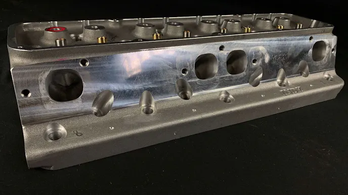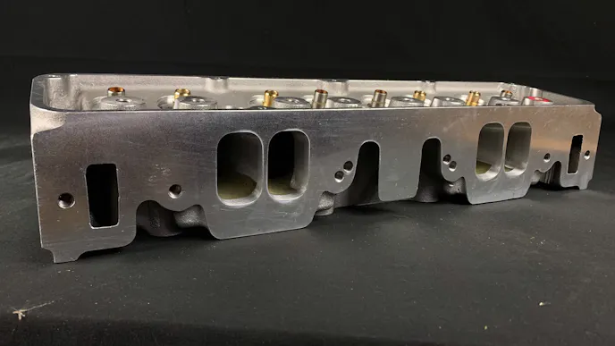 “The head as sold from INDY comes with a 235cc intake port, a 105cc exhaust, and a 69cc chamber. So a tremendous amount of welding was necessary to get the material needed to have full clean up with the intended port design. Working with a third head casting as a model and lots of epoxy, once a satisfactory intake port, exhaust port, and chamber were hand finished, the necessary data was taken to compose a CNC program to port what would become the actual race heads,” Kieffer explains.