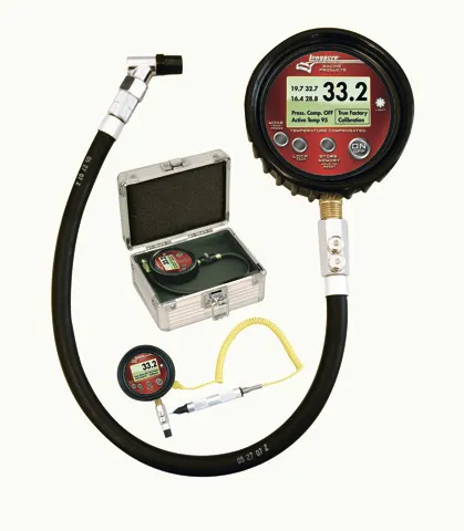 When checking pressures in tires that are at different temperatures, this professional gauge will also compensate or correct tire pressures back to a standard temperature. All that you need to do is use our probe to take the temperature of each tire and the gauge will instantly show the corrected pressure for each temperature.