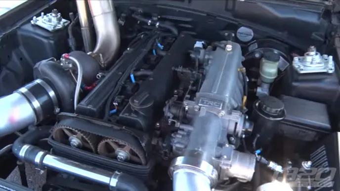 Radzins’ SupraStang currently uses a junkyard-stock 2JZ Toyota engine with just new gaskets and a modified oil pan added before it was shoehorned into the car. A TH400 from RPM Transmissions helps put the power down. A Racecraft front K-member holds the engine in place with custom rubber engine mounts from C.N.A. Performance. A custom turbo system that takes boost from a Precision 67mm turbo helps the SupraStang make big power.