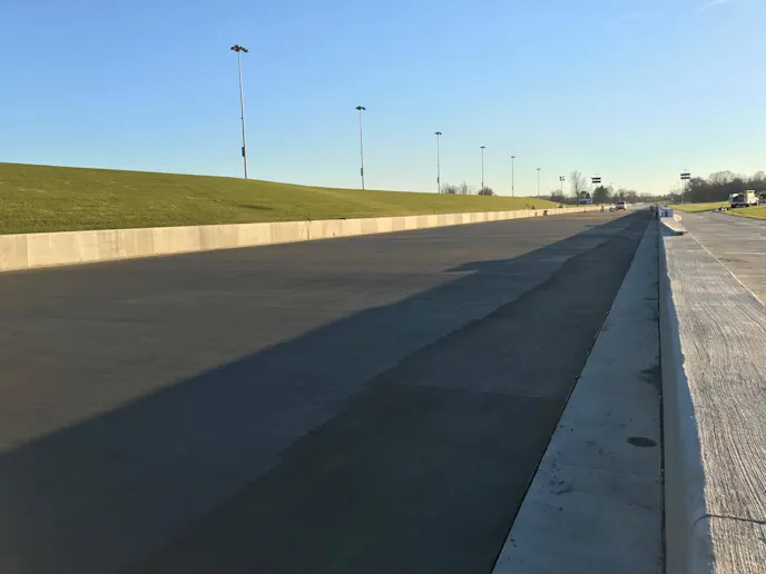 “I went with the asphalt and concrete because it’s easier to clean the rubber off the concrete. I did my research with the track prep guys. They recommend to go this route since it’s easier to keep the asphalt from peeling. The mix Melway Paving used has a polymer blend that has almost the same hardness as concrete, and was very smooth when it was laid down,” Matcham explains.