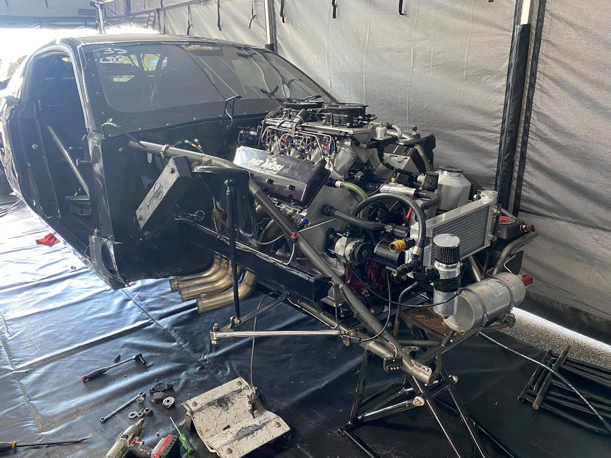 The crash left Black Plague in a crumpled heap with numerous broken parts that included a demolished wishbone, anti-roll bar, front strut, steering arm, tie rod, brake rotors, wheels, headers, and much more. After the car was delivered back to its pit, the McCain team got to work sourcing parts and repairing the Mustang. Several LDR competitors provided the McCain’s with parts and assistance to get the car running again. The effort paid off as DJ was able to make the call for the first round of the Magic 8 shootout, however, another wheelstand forced him to abort the run.